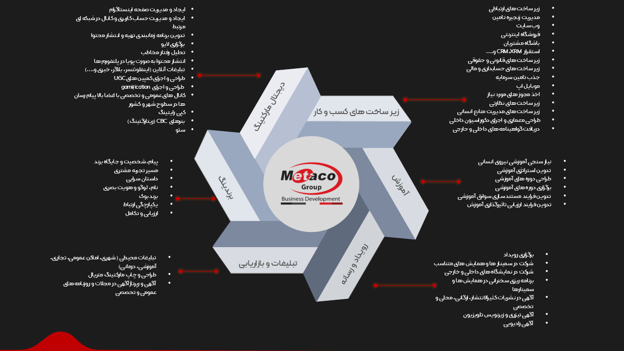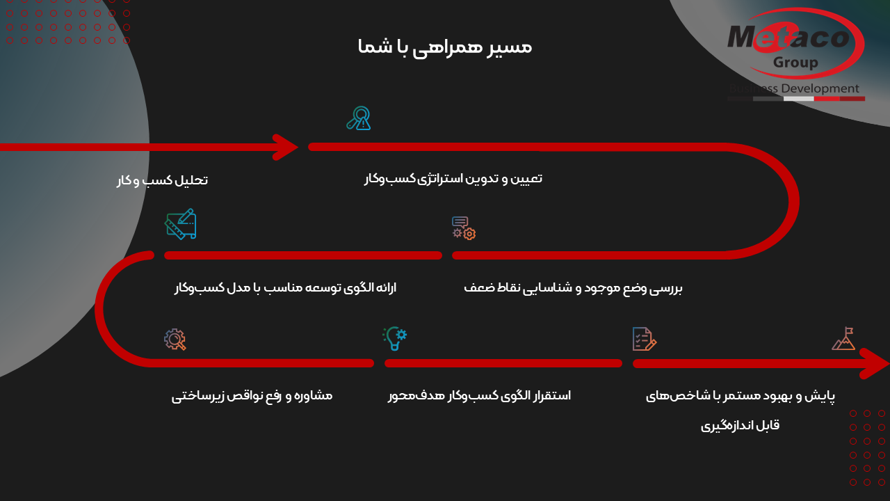 گروه توسعه کسب و کار متاکو با تکیه بر سوابق و دانش تخصصی تیم خود، تمامی گامها را همراه و برای شما بر می دارد.